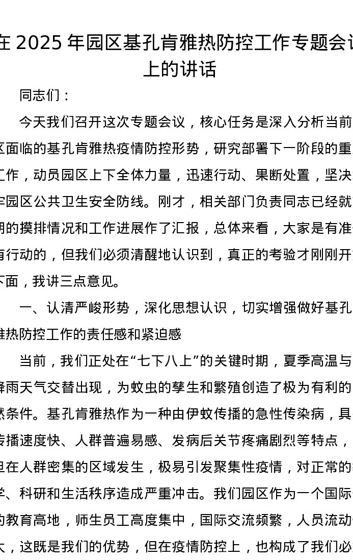 在2025年园区基孔肯雅热防控工作专题会议上的讲话