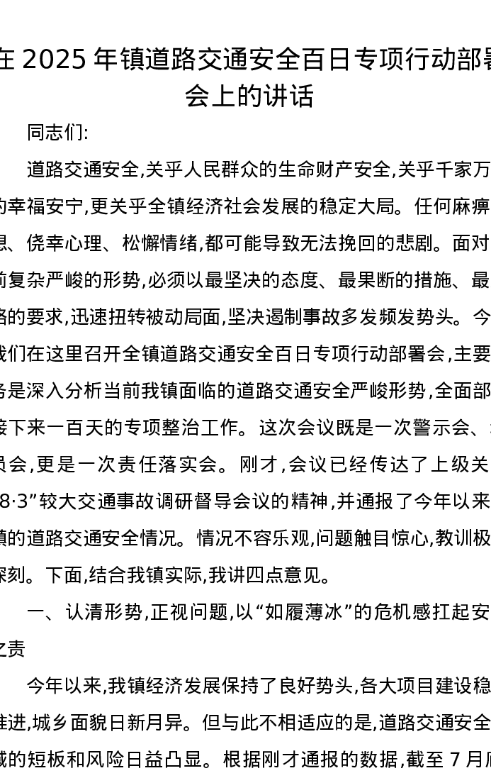 在2025年镇道路交通安全百日专项行动部署会上的讲话