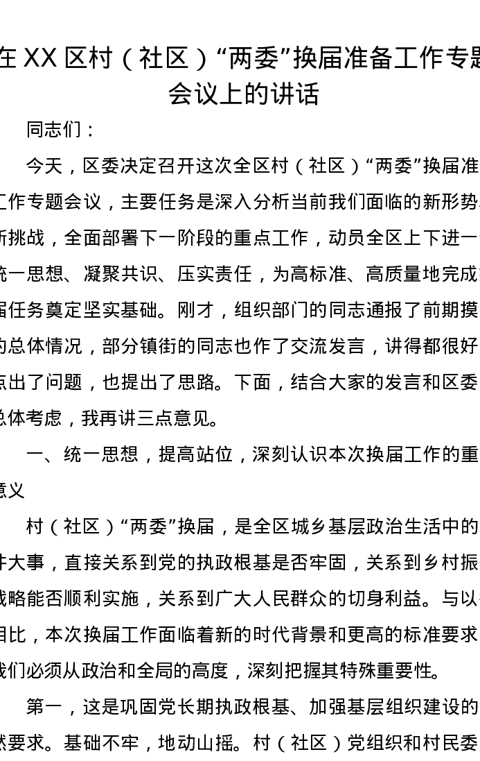 在XX区村(社区)“两委”换届准备工作专题会议上的讲话