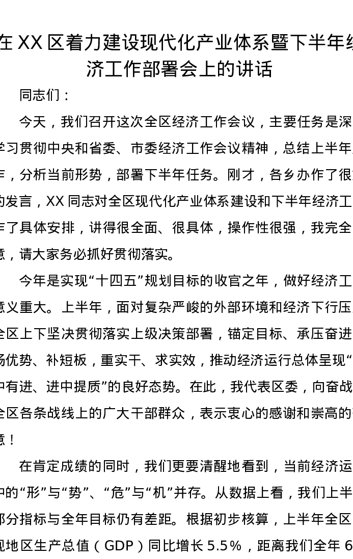 在XX区着力建设现代化产业体系暨下半年经济工作部署会上的讲话