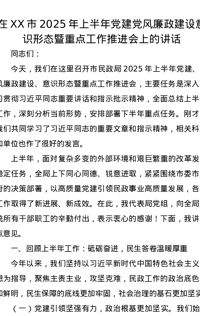 在XX市2025年上半年党建党风廉政建设意识形态暨重点工作推进会上的讲话