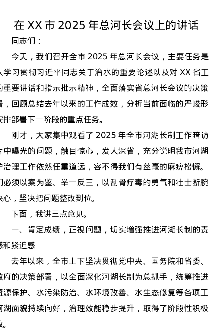 在XX市2025年总河长会议上的讲话