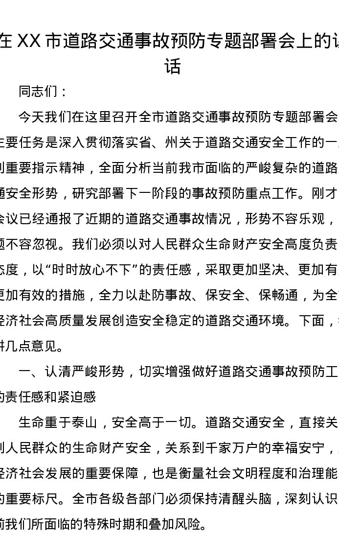 在XX市道路交通事故预防专题部署会上的讲话