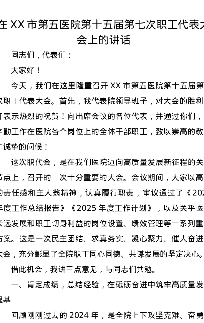 在XX市第五医院第十五届第七次职工代表大会上的讲话