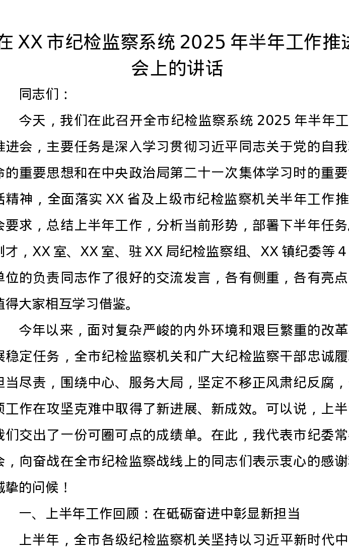 在XX市纪检监察系统2025年半年工作推进会上的讲话