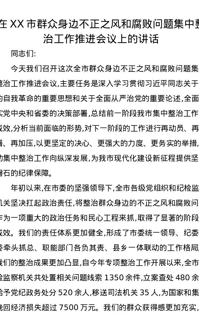 在XX市群众身边不正之风和腐败问题集中整治工作推进会议上的讲话