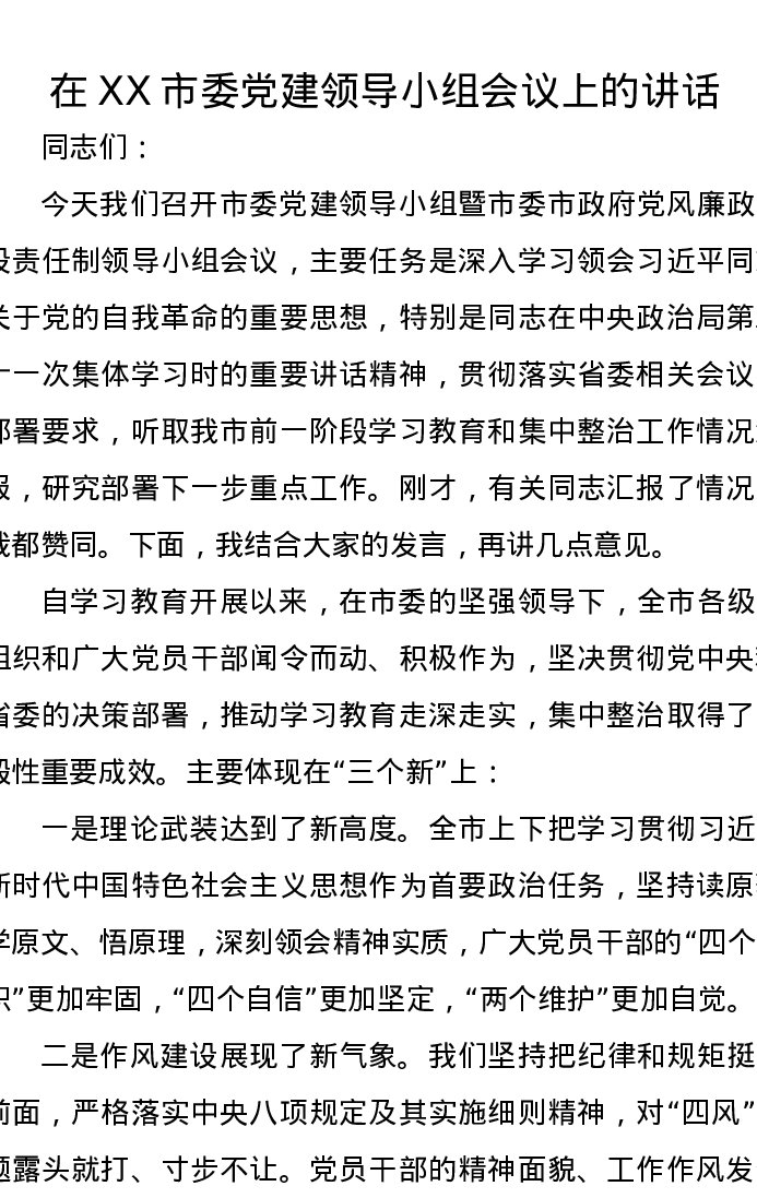 在XX市委党建领导小组(党风廉政建设责任制领导小组)会议上的讲话
