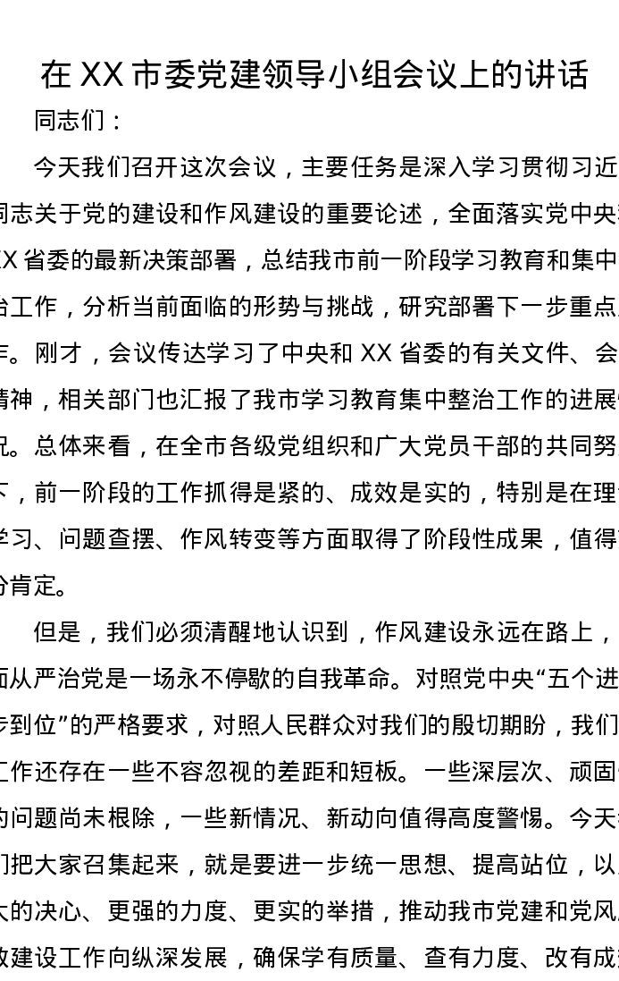 在XX市委党建领导小组(市委市政府党风廉政建设责任制领导小组)会议上的讲话