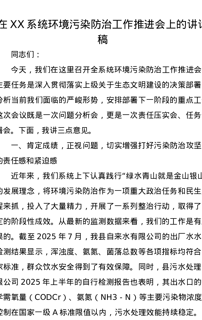 在XX系统环境污染防治工作推进会上的讲话稿