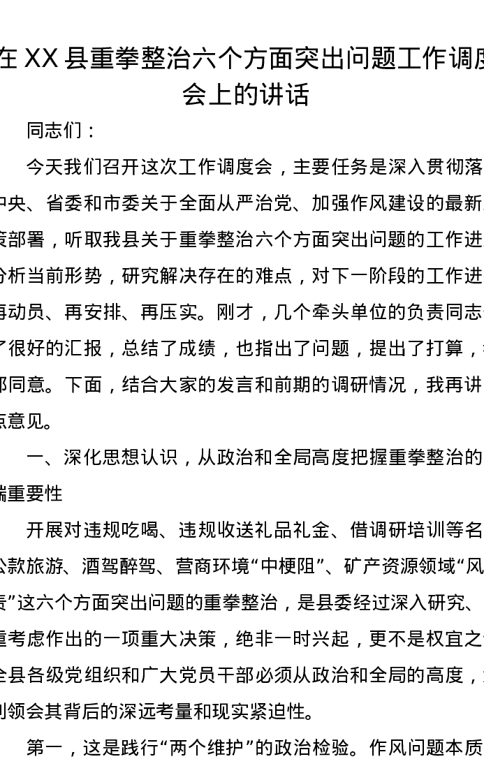 在XX县重拳整治六个方面突出问题工作调度会上的讲话