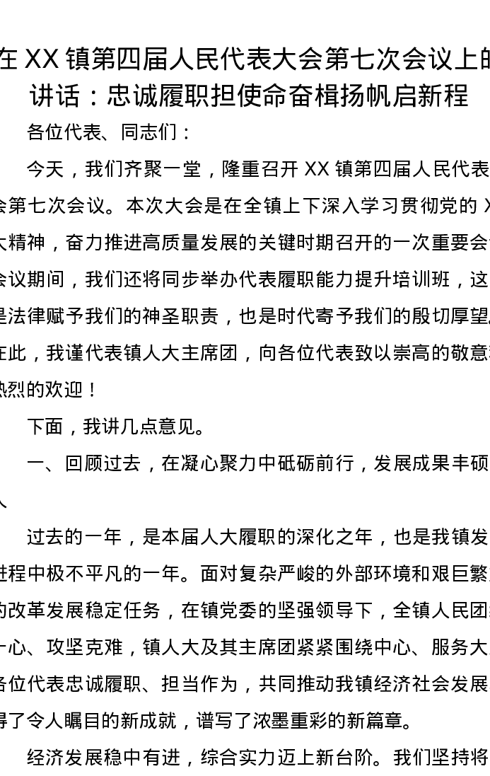 在XX镇第四届人民代表大会第七次会议上的讲话:忠诚履职担使命奋楫扬帆启新程