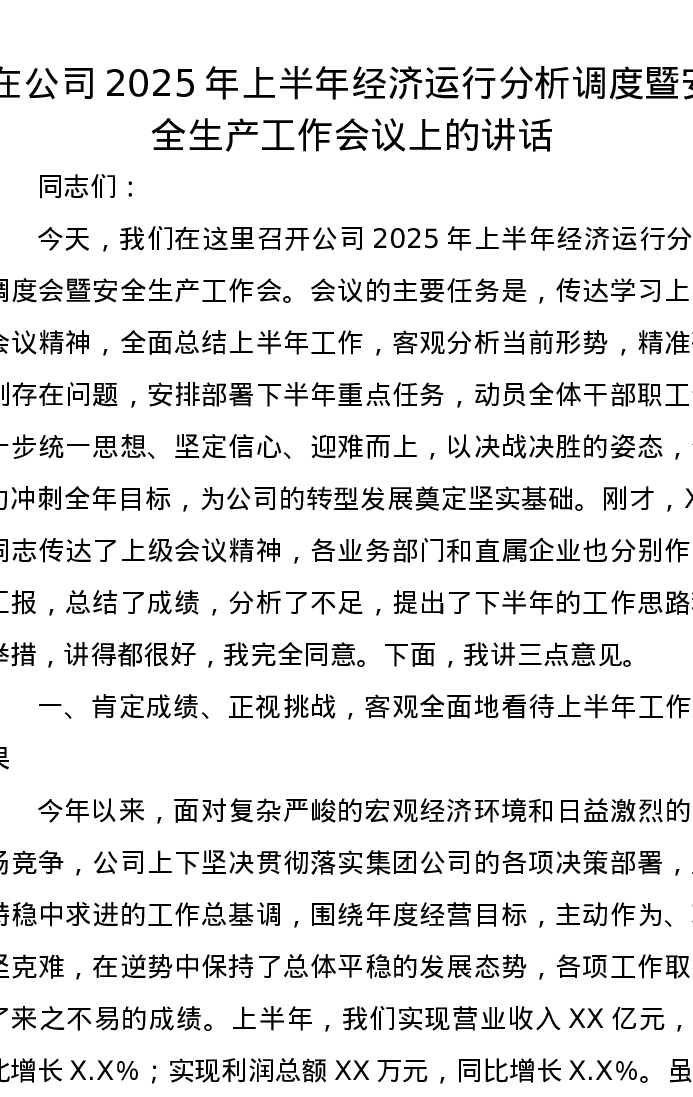 在公司2025年上半年经济运行分析调度暨安全生产工作会议上的讲话