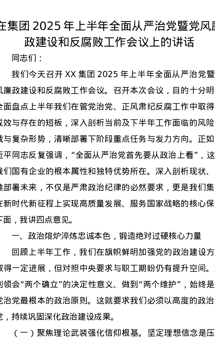 在集团2025年上半年全面从严治党暨党风廉政建设和反腐败工作会议上的讲话