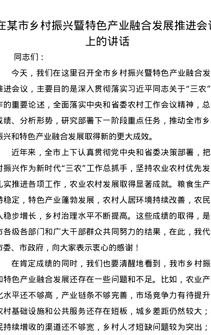 在某市乡村振兴暨特色产业融合发展推进会议上的讲话