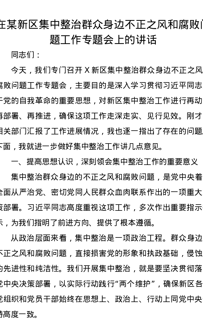 在某新区集中整治群众身边不正之风和腐败问题工作专题会上的讲话