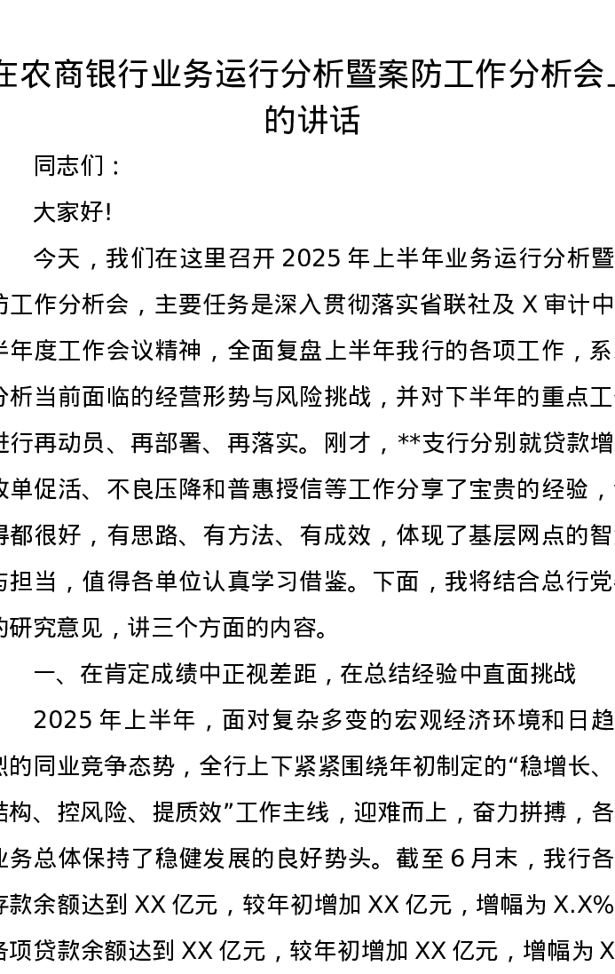 在农商银行业务运行分析暨案防工作分析会上的讲话