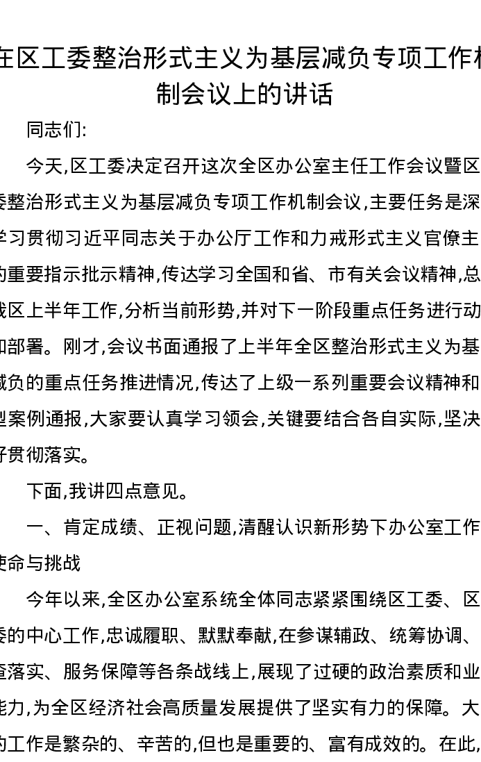 在区工委整治形式主义为基层减负专项工作机制会议上的讲话