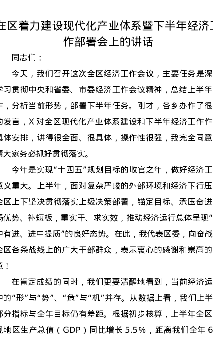 在区着力建设现代化产业体系暨下半年经济工作部署会上的讲话