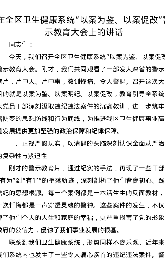在全区卫生健康系统“以案为鉴、以案促改”警示教育大会上的讲话