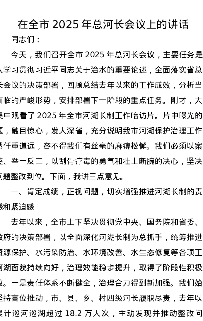 在全市2025年总河长会议上的讲话