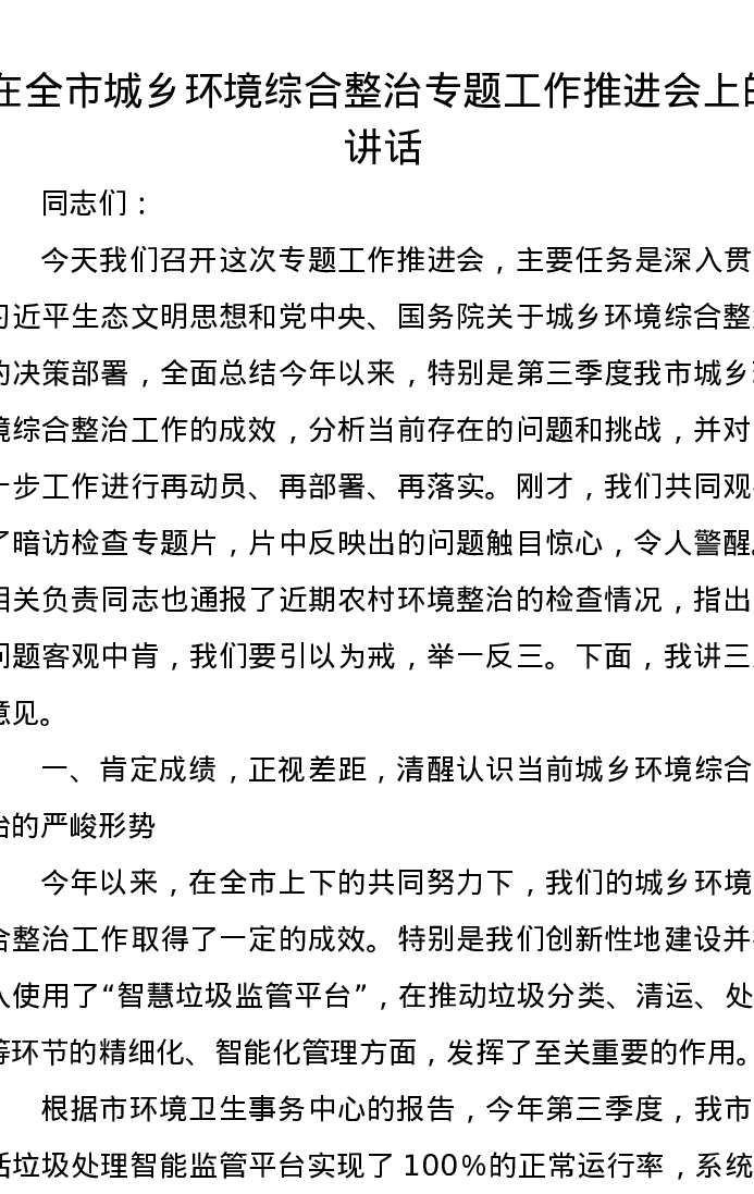 在全市城乡环境综合整治专题工作推进会上的讲话