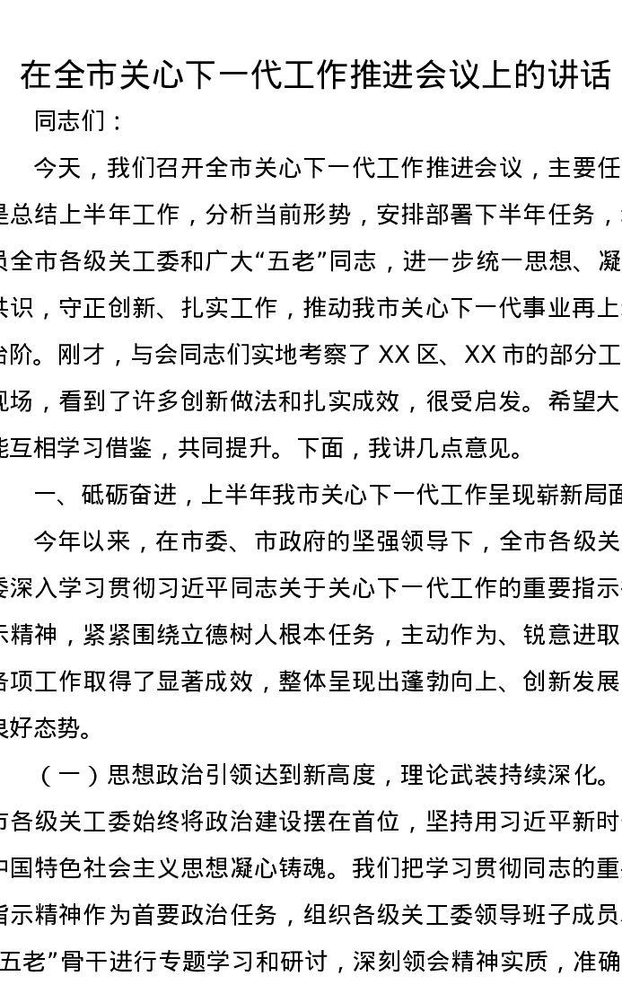 在全市关心下一代工作推进会议上的讲话