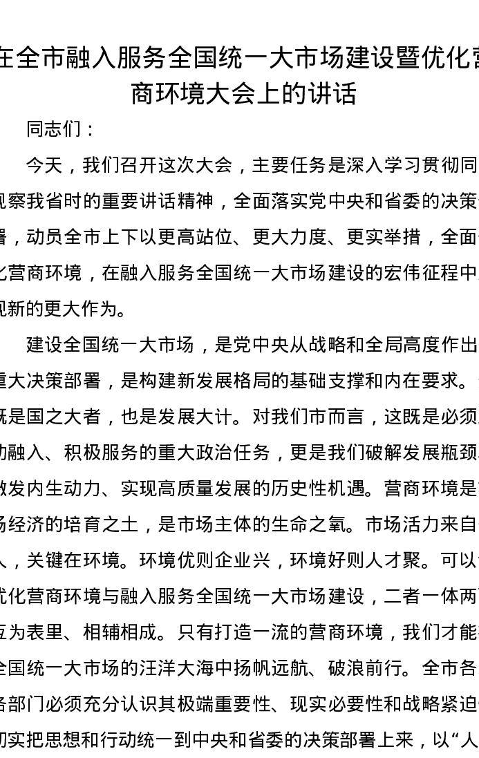 在全市融入服务全国统一大市场建设暨优化营商环境大会上的讲话