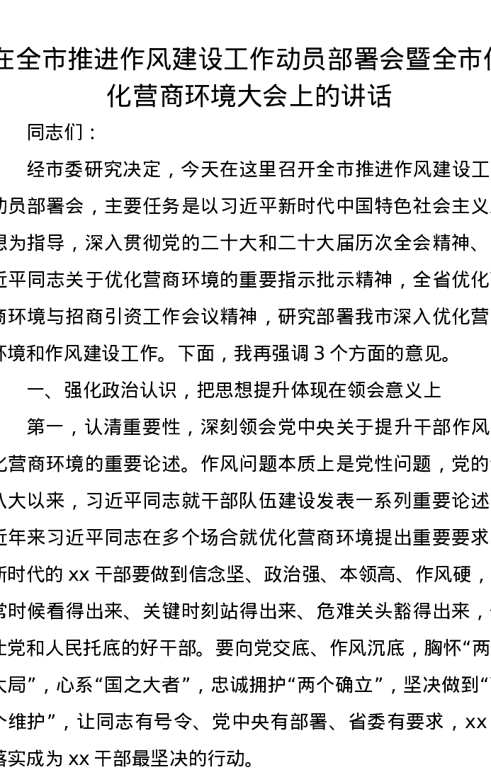 在全市推进作风建设工作动员部署会暨全市优化营商环境大会上的讲话