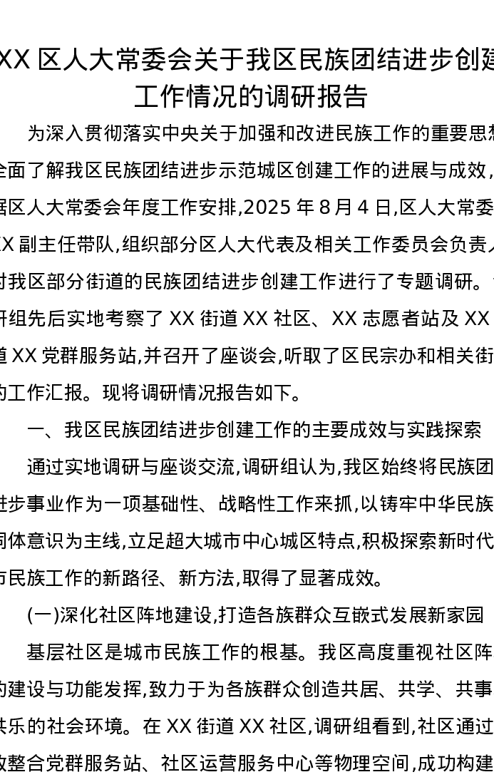 XX区人大常委会关于我区民族团结进步创建工作情况的调研报告