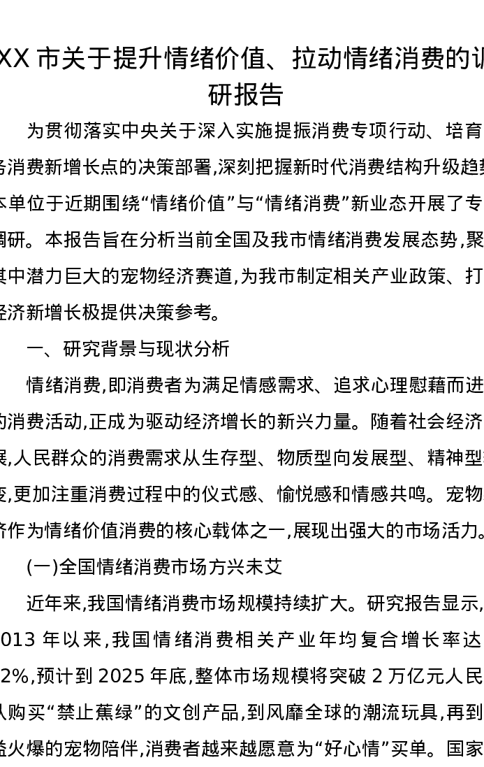 XX市关于提升情绪价值、拉动情绪消费的调研报告