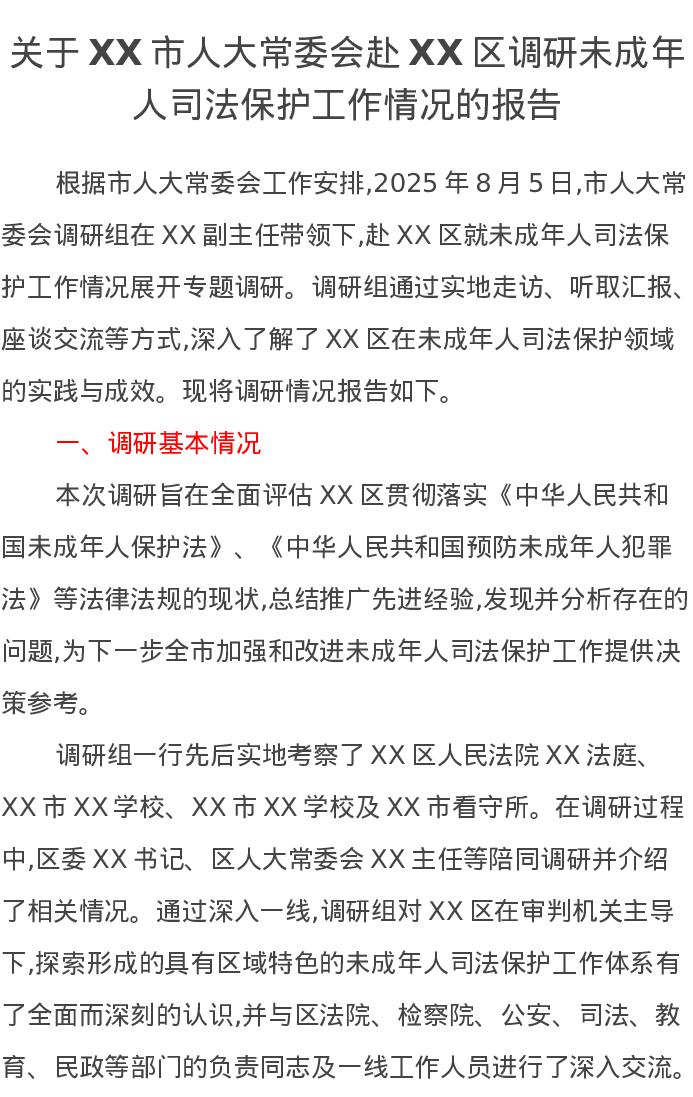 关于XX市人大常委会赴XX区调研未成年人司法保护工作情况的报告