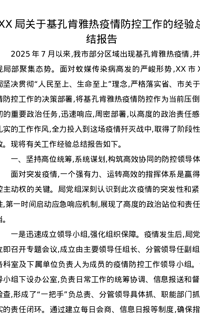 XX局关于基孔肯雅热疫情防控工作的经验总结报告