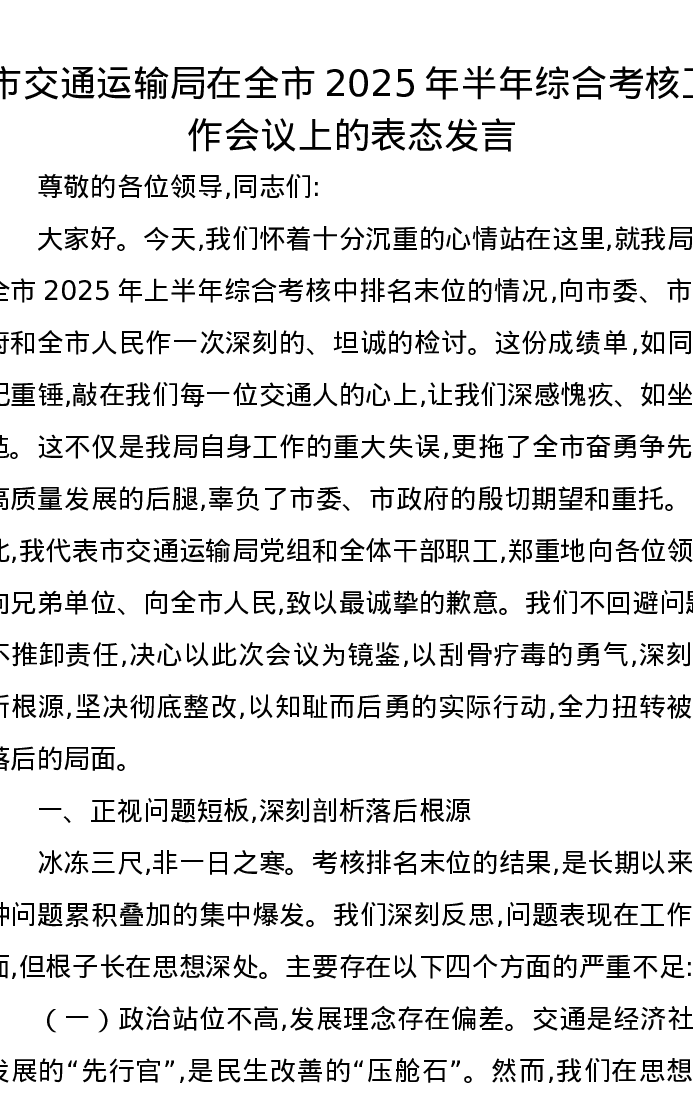 市交通运输局在全市2025年半年综合考核工作会议上的表态发言
