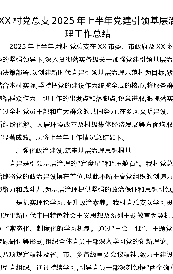 XX村党总支2025年上半年党建引领基层治理工作总结