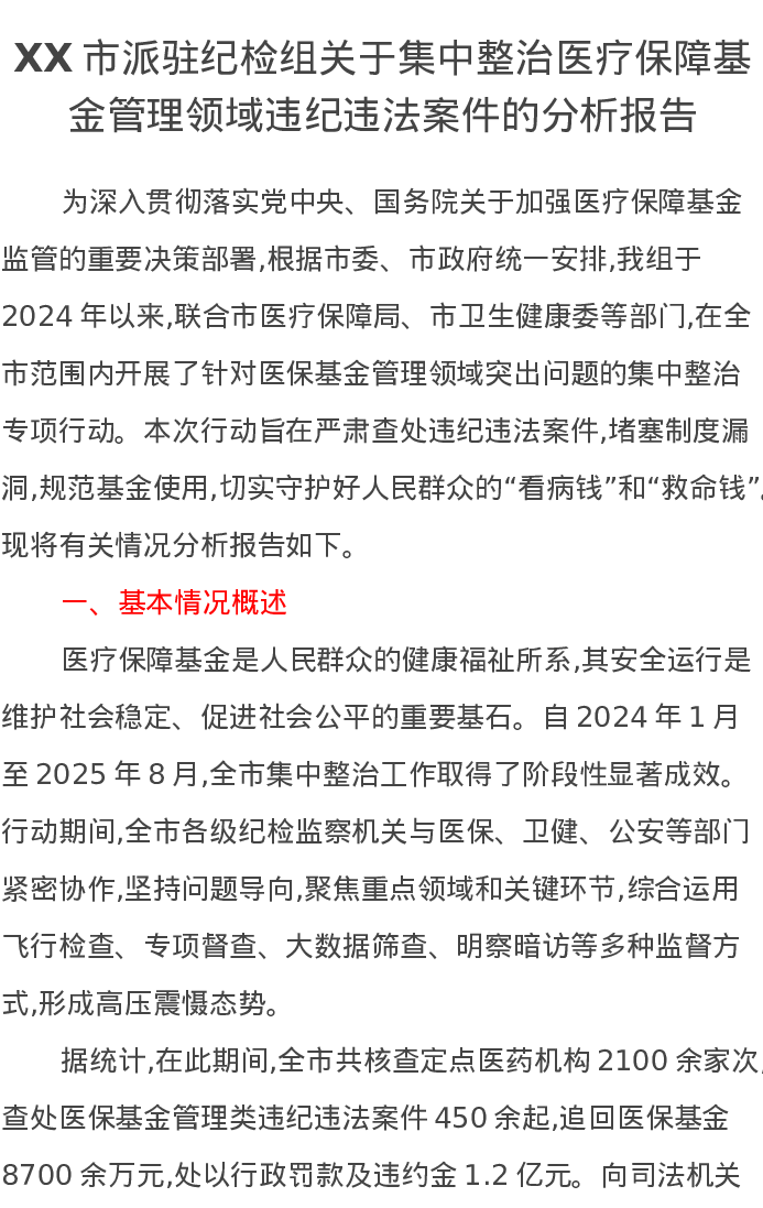 XX市派驻纪检组关于集中整治医疗保障基金管理领域违纪违法案件的分析报告