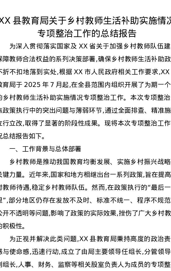 XX县教育局关于乡村教师生活补助实施情况专项整治工作的总结报告