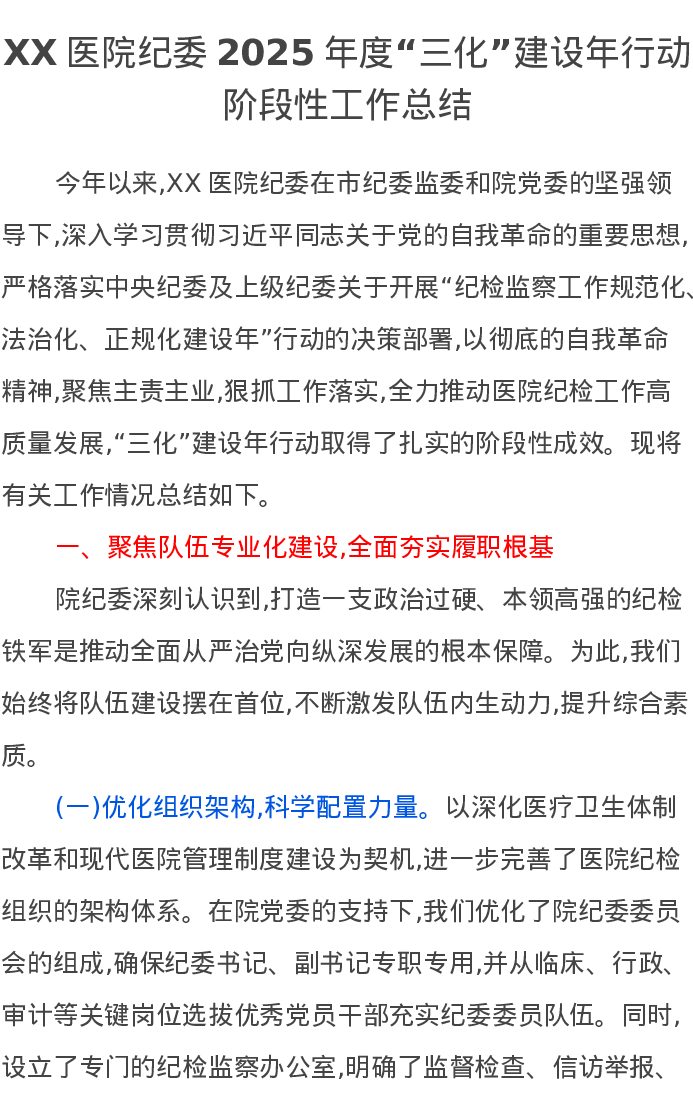 XX医院纪委2025年度“三化”建设年行动阶段性工作总结