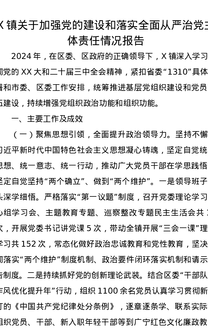 X镇关于加强党的建设和落实全面从严治党主体责任情况报告