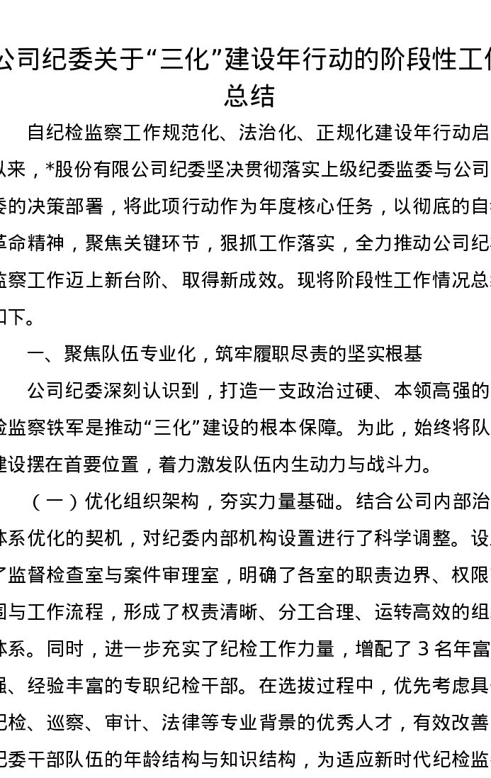 公司纪委关于“三化”建设年行动的阶段性工作总结