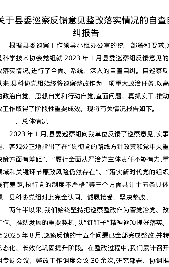 关于县委巡察反馈意见整改落实情况的自查自纠报告