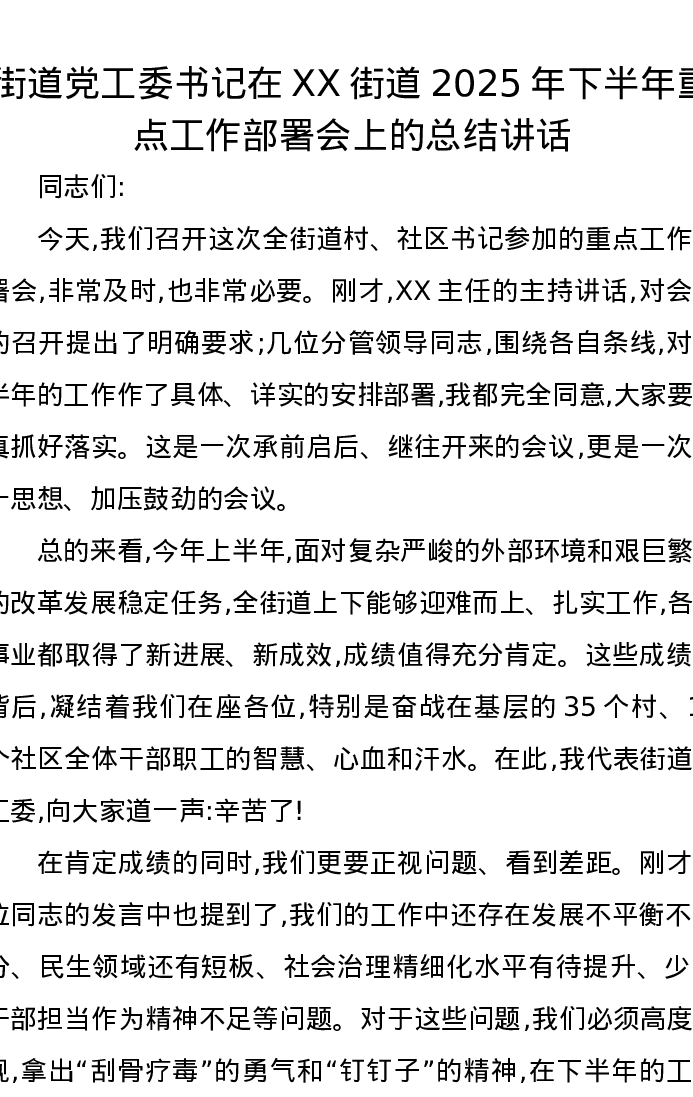 街道党工委书记在XX街道2025年下半年重点工作部署会上的总结讲话