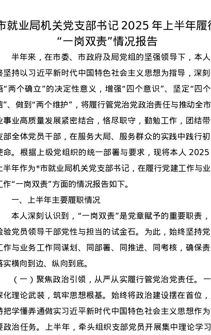 市就业局机关党支部书记2025年上半年履行“一岗双责”情况报告