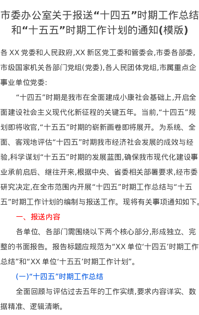 市委办公室关于报送“十四五”时期工作总结和“十五五”时期工作计划的通知(模版)