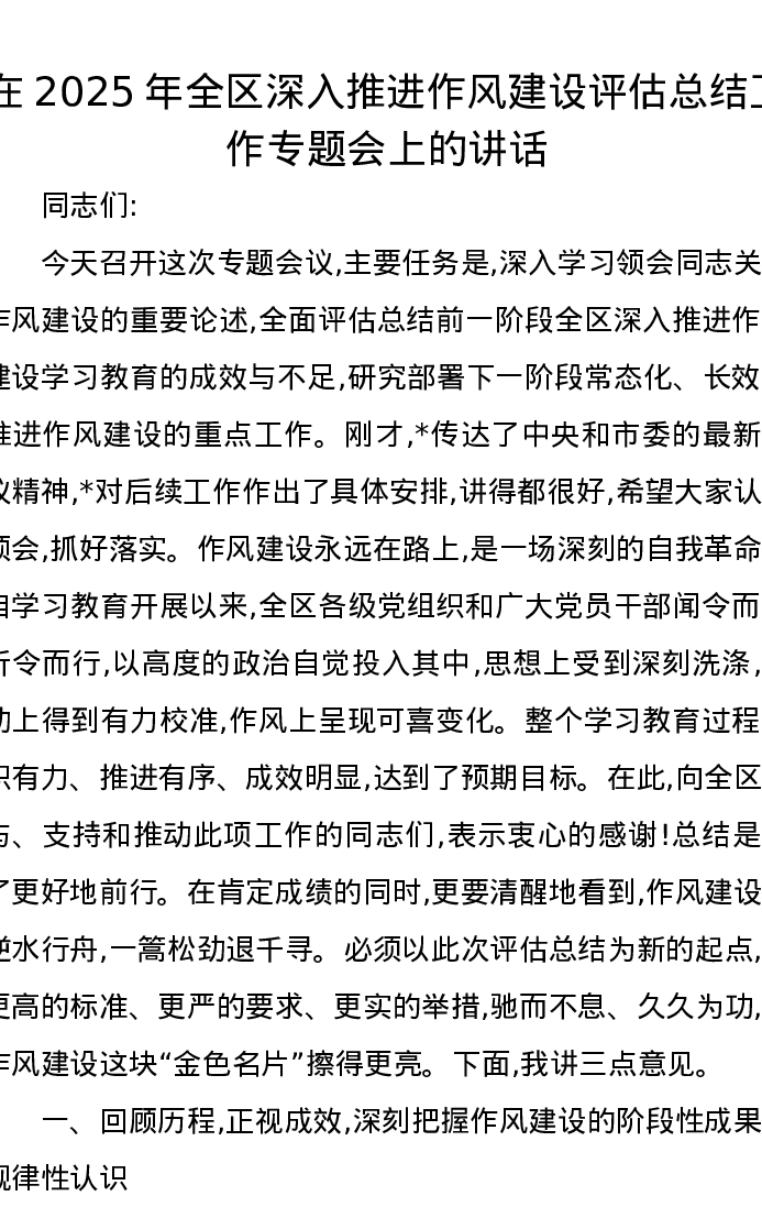在2025年全区深入推进作风建设评估总结工作专题会上的讲话