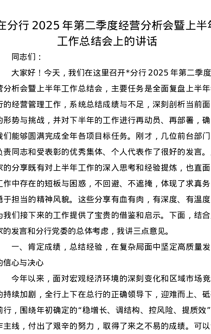 在分行2025年第二季度经营分析会暨上半年工作总结会上的讲话