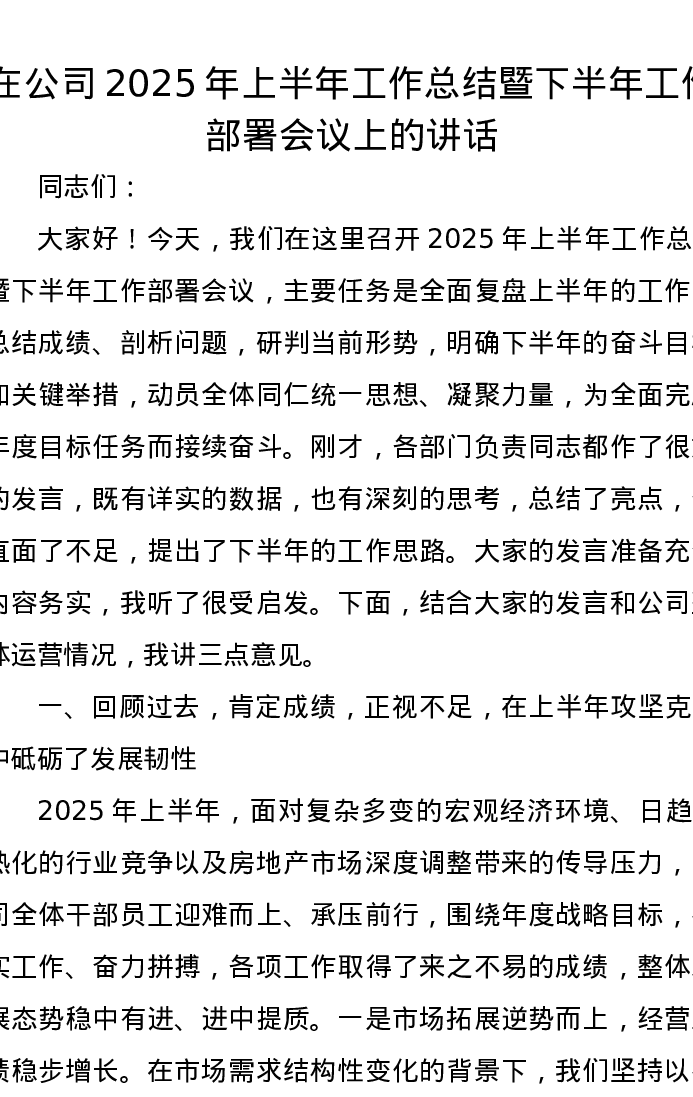 在公司2025年上半年工作总结暨下半年工作部署会议上的讲话