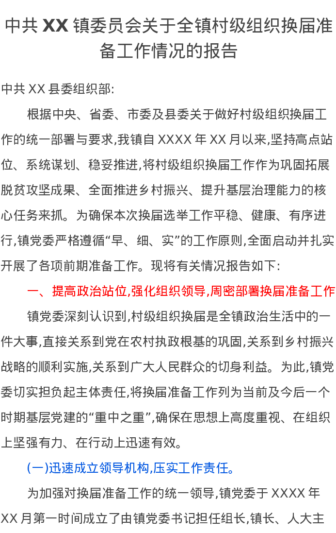 中共XX镇委员会关于全镇村级组织换届准备工作情况的报告