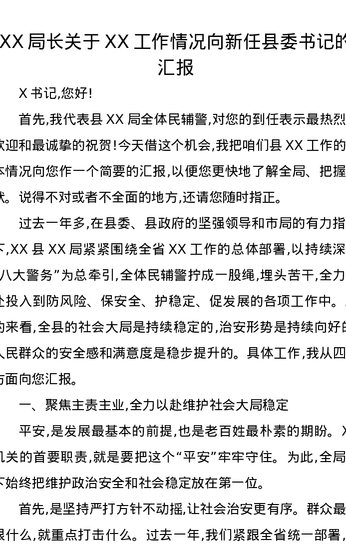 XX局长关于XX工作情况向新任县委书记的汇报