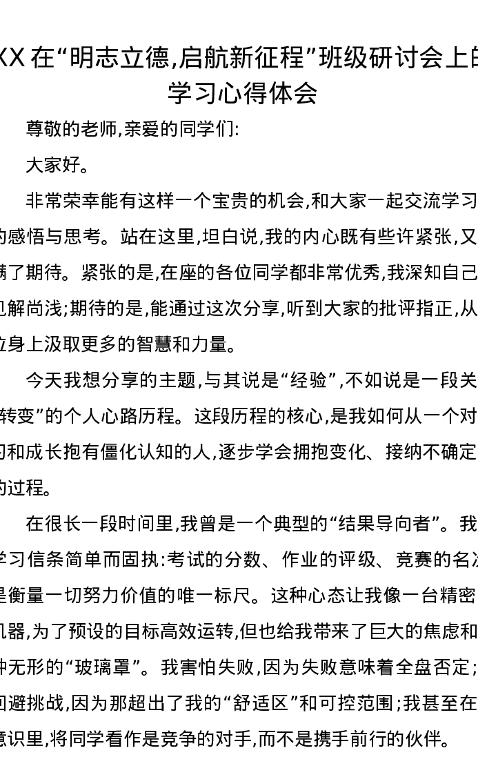 XX在“明志立德,启航新征程”班级研讨会上的学习心得体会