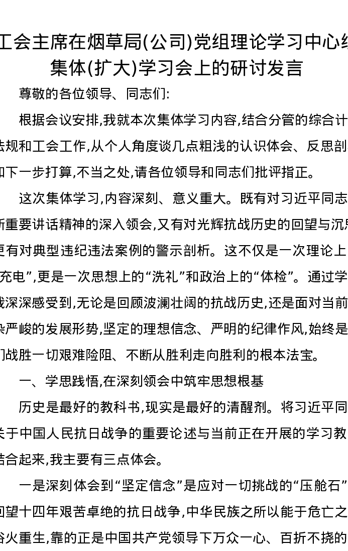 工会主席在烟草局(公司)党组理论学习中心组集体(扩大)学习会上的研讨发言